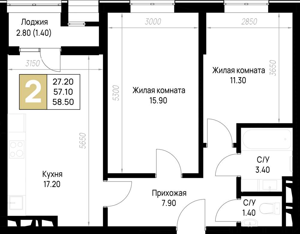 Жилая площадь 57.77 м2, кухня 10.65 м2, чистовая отделка с мебелью.