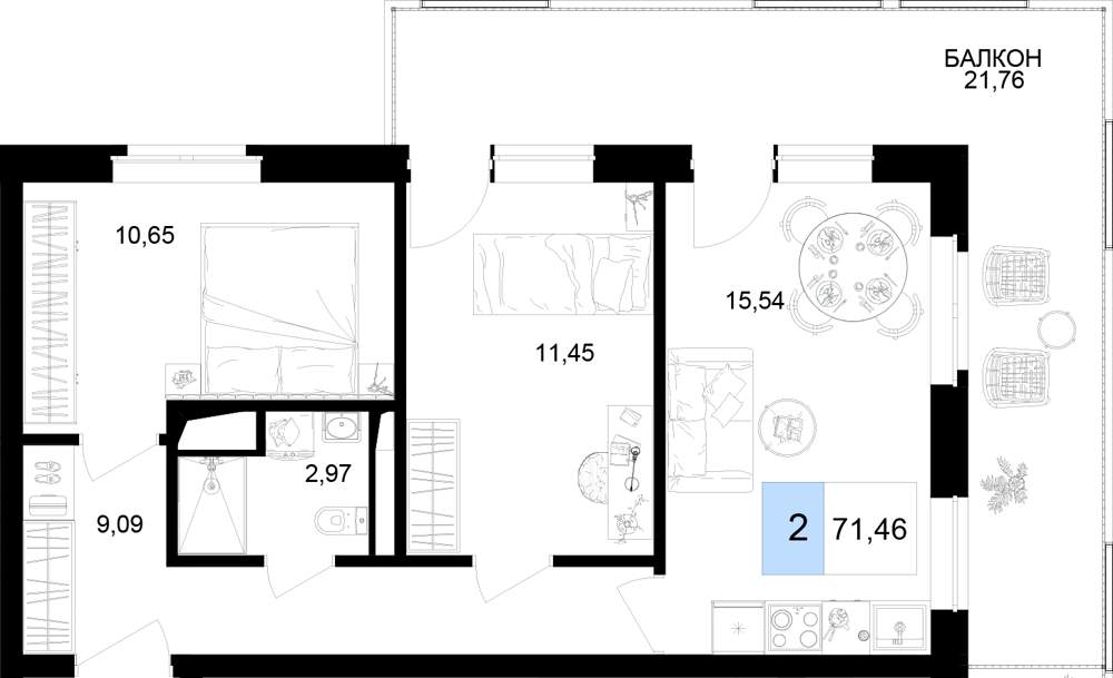 Жилая площадь 57.77 м2, кухня 10.65 м2, чистовая отделка с мебелью.