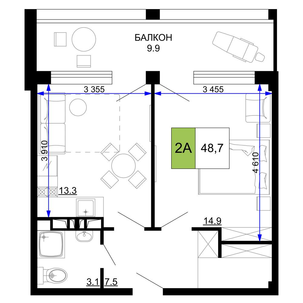 Жилая площадь 15.8 м2, кухня 19.3 м2, чистовая отделка с мебелью.