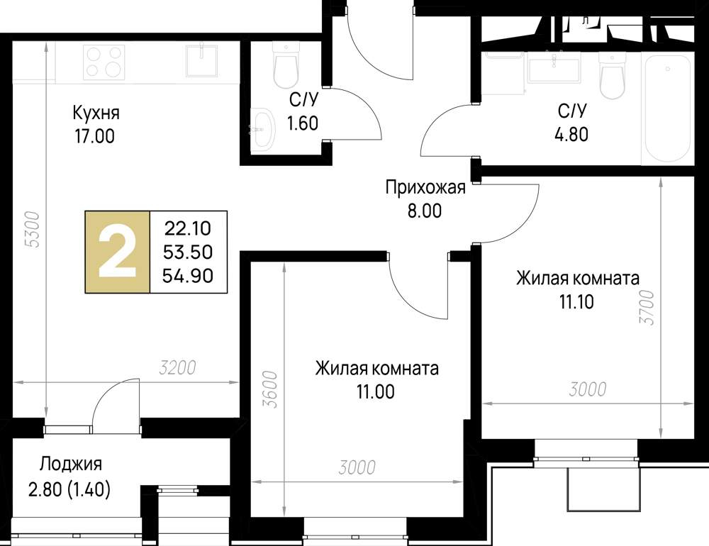 Жилая площадь 15.6 м2, кухня 13.3 м2, чистовая отделка с мебелью.
