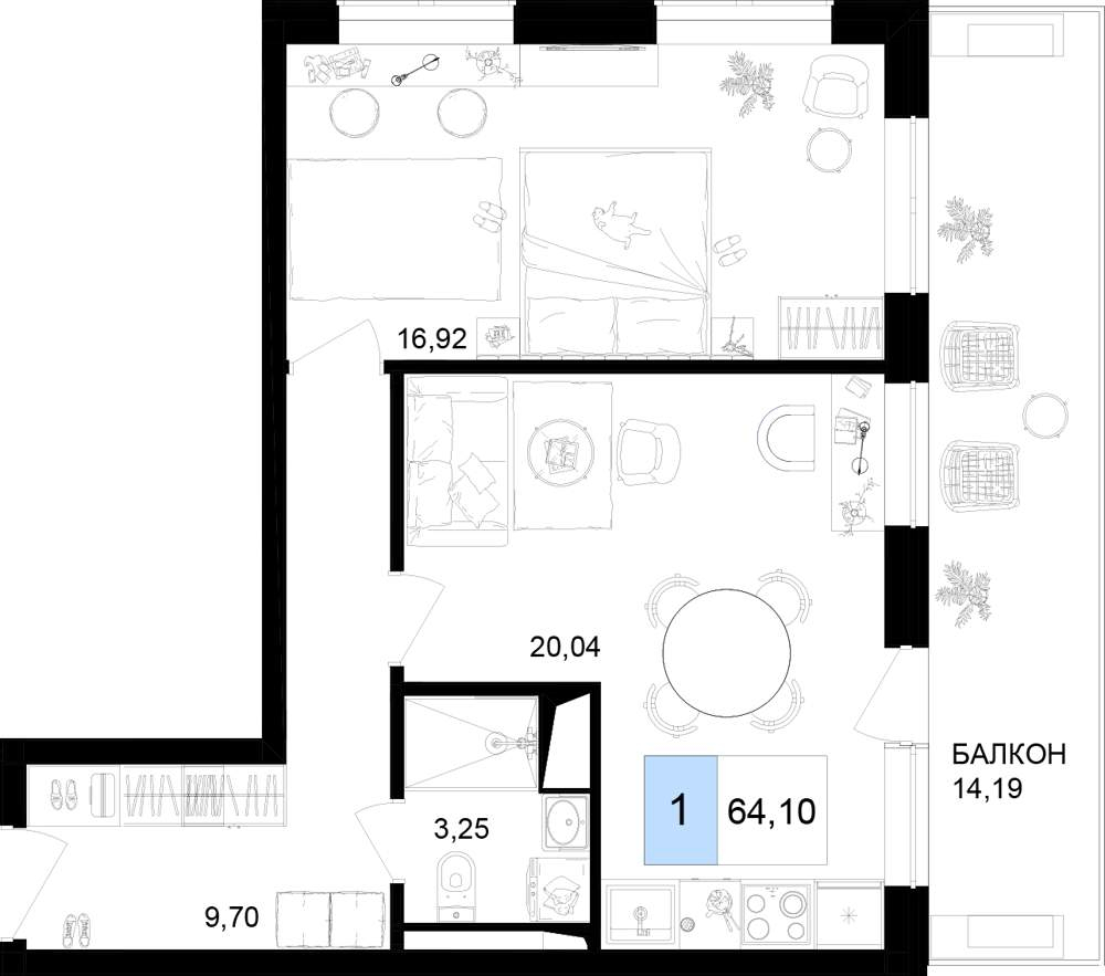 Жилая площадь 41.86 м2, кухня 20.04 м2, чистовая отделка с мебелью, комнаты изолированные.