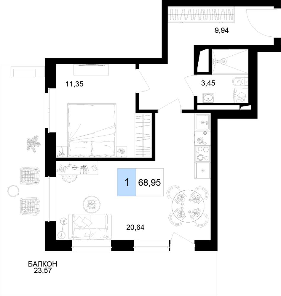 Жилая площадь 45.89 м2, кухня 20.64 м2, чистовая отделка с мебелью, комнаты изолированные.
